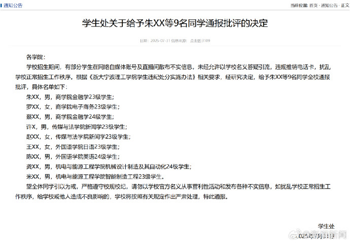 7月31日,浙大宁波理工学院学生处发布《关于给予朱XX等9名同学通报批评的决定》称,“学校招生期间,有部分学生在网络自媒体账号及直播间散布不实信息,未经允许以学校名义答疑引流,违规推销电话卡,扰乱学校正常招生工作秩序。根据《浙大宁波理工学院学生违纪处分实施办法》相关要求富鑫中证,经研究决定,给予朱XX等9名同学全校通报批评。”