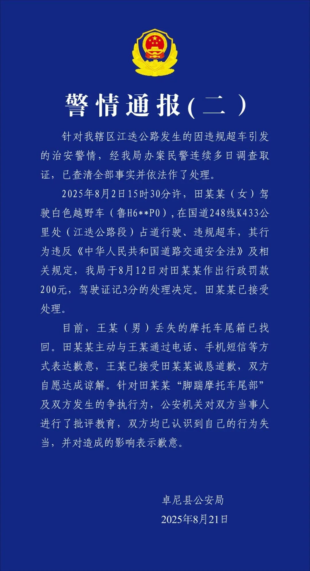 8月3日11时03分,卓尼县公安局首次接到王某电话报警,称其摩托车尾箱丢失,要求田某某赔偿并公开致歉。接报后,县公安局立即受理,通过调取相关视频、电话询问双方当事人等方式进行了调查(双方当事人及车辆均已离开甘南州境内),并作了调解,但双方均不接受。鉴于双方未达成调解意向,县公安局已派出工作组分别前往当事人所在地进一步调查,将根据调查结果依法作出处理。