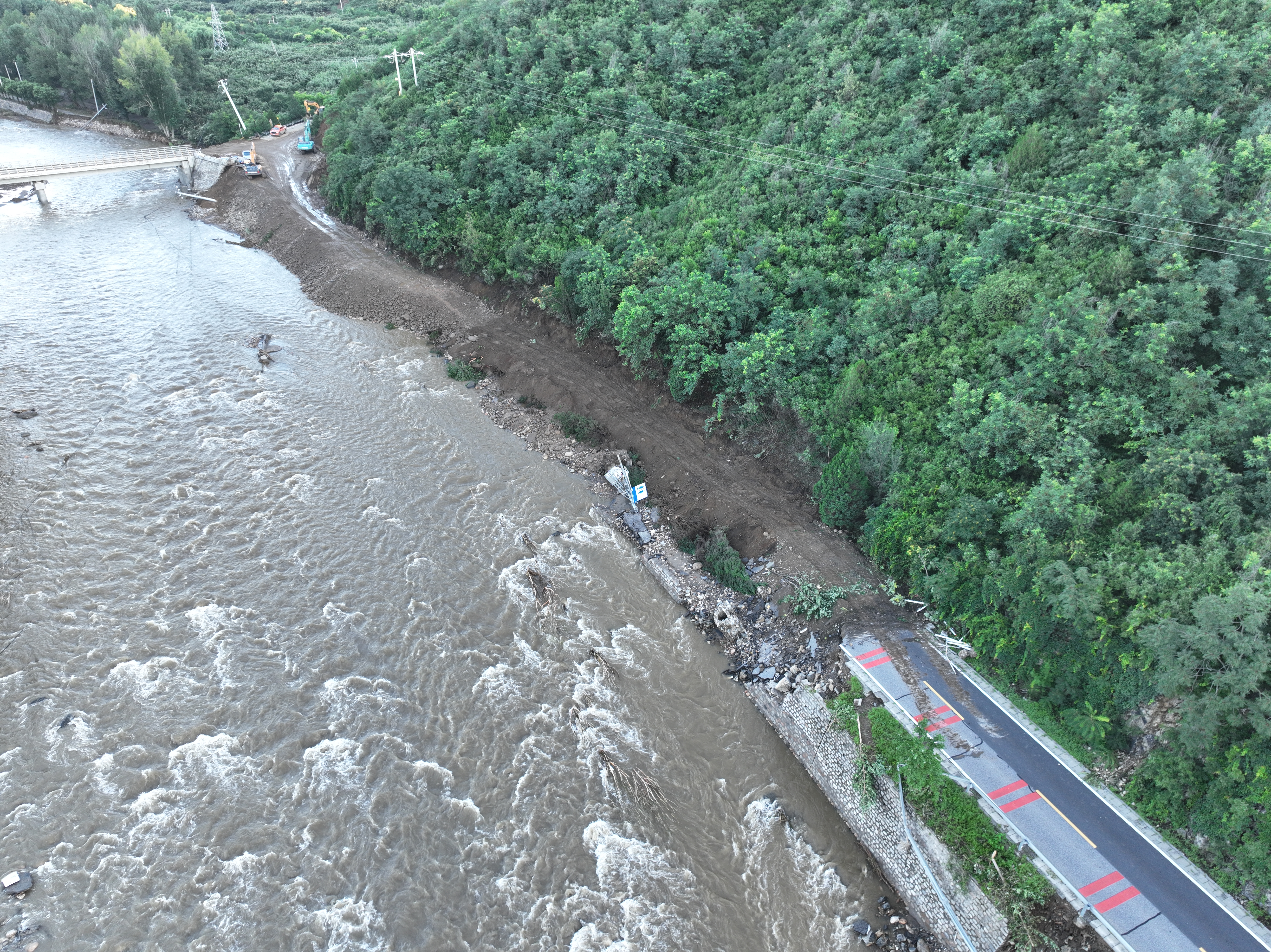 图为无人机在密云区拍摄的兴阳线道路抢通现场。(北京市交通委供图)