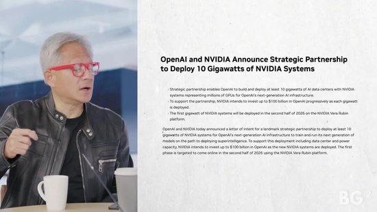 主持人Gerstner: 这自然就引出了本周的热点话题:几天前,你宣布了与 OpenAI 的 Stargate 项目达成重大合作,NVIDIA 将成为其首选合作伙伴,并计划投资 1000 亿美元。他们要建设 10 千兆瓦的算力。如果全部使用 NVIDIA 的产品,这可能为 NVIDIA 带来高达 4000 亿美元的收入。所以,能否请你谈谈这次合作对你意味着什么?以及为什么这项投资对 NVIDIA 来说是明智之举?