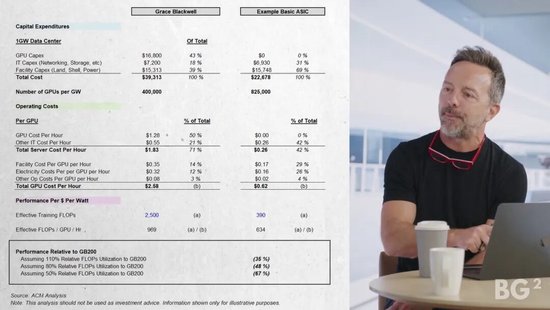 AI 芯片的成本优势: NVIDIA 的系统级设计使其每瓦性能远超竞争对手。即便对手的 ASIC 芯片免费,NVIDIA 的系统在总拥有成本(TCO,包括电力、数据中心等)上仍具备显著优势。