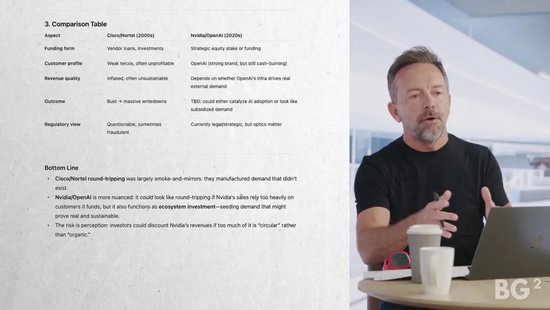 主持人Gerstner: 这些宏大的数字也让人们开始讨论“供过于求”或“泡沫”。扎克伯格上周在播客中坦言,未来某个节点很可能会出现需求“真空期”(air pocket),Meta可能会在某方面超额投资100亿美元。但他认为这没关系,因为这是关乎业务未来的必要风险。这听起来有点像“囚徒困境”,不是吗?